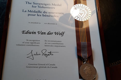Uit handen van ambassadeur Sabine Nölke van Canada heeft Edwin van der Wolf een hoge Canadese onderscheiding ontvangen. De Hattemer ontving ‘The Sovereign’s Medal for Volunteers' onder andere voor zijn researchwerk voor het Informatiecentrum Canadese Begraafplaats in Holten. Tijdens een indrukwekkende ceremonie in de residentie van de Canadese ambassadeur op Villa Groot Haesebroek in Wassenaar benadrukte de ambassadeur hoe uitzonderlijk het is dat iemand die niet in bezit is van de Canadese nationaliteit deze onderscheiding ontvangt. Een aantal familieleden en genodigden uit Hattem en Holten was meegereisd naar Wassenaar om getuige te zijn van de feestelijke bijeenkomst rondom het toekennen van de onderscheiding.
